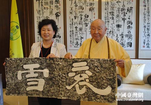 图为朱静芝率团拜会陕西教育参访团拜会中台禅寺惟觉大和尚并赠送曹操“滚雪”拓片。(陕西省台办 赵有奇 摄 )