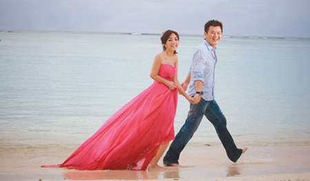 庹宗康(右)与王菲雅赤脚在海滩上拍婚纱,浪漫唯美。 来源:台湾《联合报》