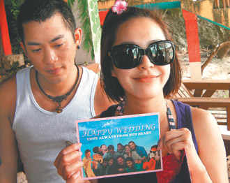 高山峰(后)未婚妻怀孕4个月,两人来关岛沾喜气。来源:台湾《联合报》