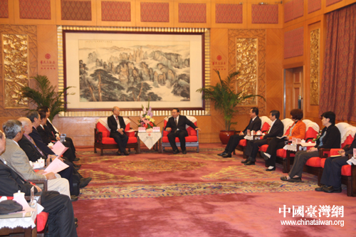 湖南省委副书记梅克保(左)4月2日在长沙会见了以张京育(右)为理事长的中华湖湘文化发展协会一行。(中国台湾网 杨丽 摄)
