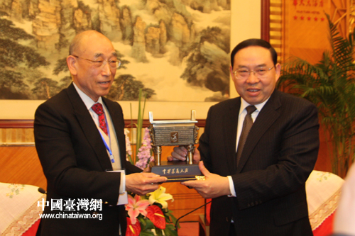 湖南省委副书记梅克保4月2日在长沙会见了以张京育为理事长的中华湖湘文化发展协会一行。图为会见后梅克保(左)向张京育(右)赠送礼物。(中国台湾网 杨丽 摄)
