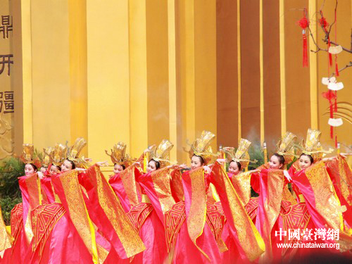 乐舞敬拜环节,舞者金色高冠、大红色镶金边的华服古色古香。(中国台湾网 马迪 摄)