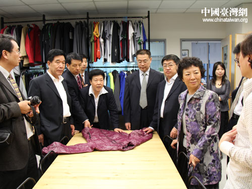 宁夏纺织产业考察团考察台湾兴采实业股份公司研发的新面料(左二为宁夏自治区政协副主席解孟林,右二为宁夏自治区党委副秘书长、台办主任张秀燕)。图片来源:宁夏台办