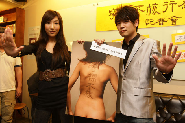 李宓(左)拿着5年前拍摄的《宁裸不核》裸照, 预告25日再次脱衣反核。图片来源:台湾媒体