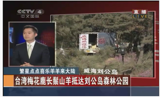 台赠大陆长鬃山羊梅花鹿抵达威海刘公岛国家深林公园。图片来源:中央电视台