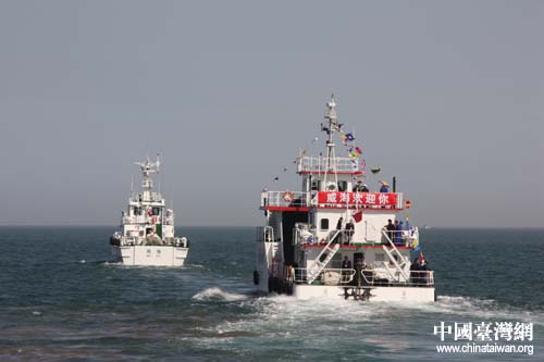 旅游船、海事船等组成的舰艇编队驶向刘公岛。(中国台湾网 刘海伟 摄)