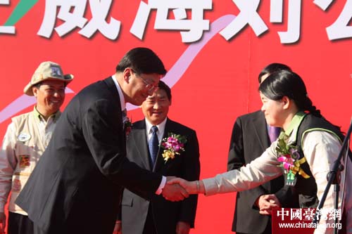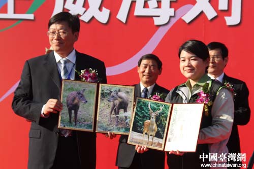 台北市动物园动物组组长石芝菁与威海刘公岛国家森林动物园管理处主任王建松交接动物谱系。(中国台湾网 刘海伟摄)
