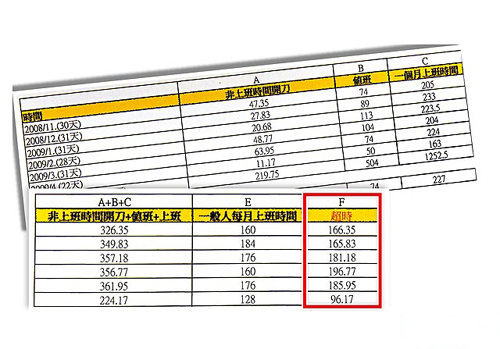 蔡伯羌妻子整理丈夫病倒前半年上班时数,每月较一般人超时100多小时(红框)。图片来源:台湾媒体