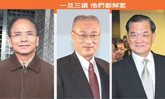 游锡堃(左一)、吴敦义(中)、连战。一旦特别费条例三读通过,他们都将解套。图片来源:台湾《联合报》