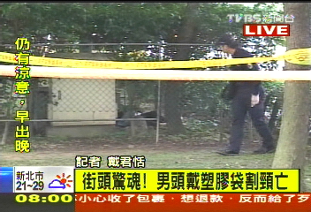 中国台湾网4月21日消息 据台湾TVBS电视台报道,台北市闹区街头今(21)日早上传出离奇死亡案件。在台北市敦化南路远企大楼前方的安全岛,发现有一名男子倒卧在电箱旁,头上戴有塑料袋,脖子上有明显割痕。