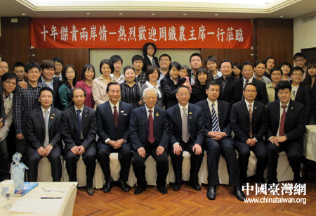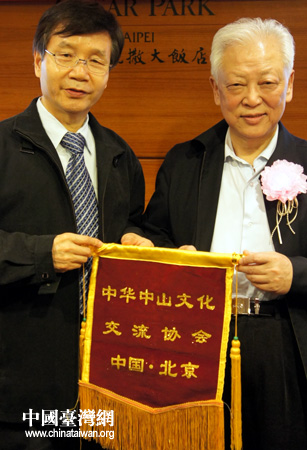 周铁农代表参访团一行向台湾中华花艺文教基金会黄永川理事长赠送锦旗(图片来源:民革中央)