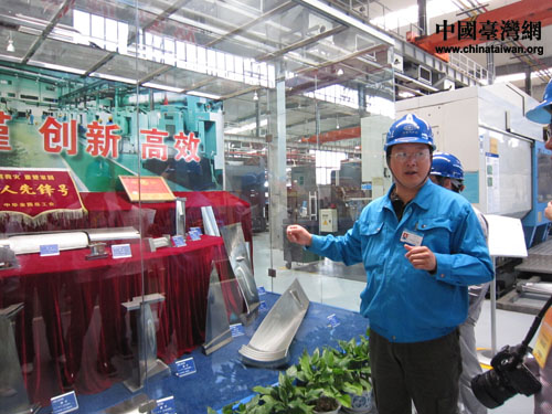 东汽党委宣传部副部长孙岩松向网媒记者展示东汽自主创新产品。(中国台湾网 朱毅 摄)