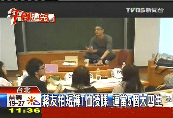 中国台湾网4月25日消息 据台湾TVBS电视台报道,今年刚刚进入台湾亚洲大学教书的蒋友柏,已经开除5个学生,日前还把学生们带到自己的公司上课,穿短裤、T恤,还抽烟飙脏话,小腿上看来像刺青的图案也很吸睛。不过学生们大都认为,蒋友柏老师直接告知社会现实面,让大家收获很多。蒋友柏也称这就是他最想教给学生的东西。