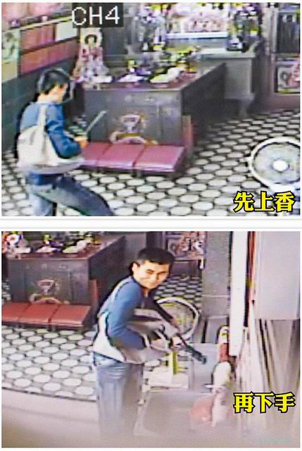 林炜强先点香拜拜求心安(上图);破坏赛钱箱时,贼头贼脑观察周边动静(下图)。图片来自网络
