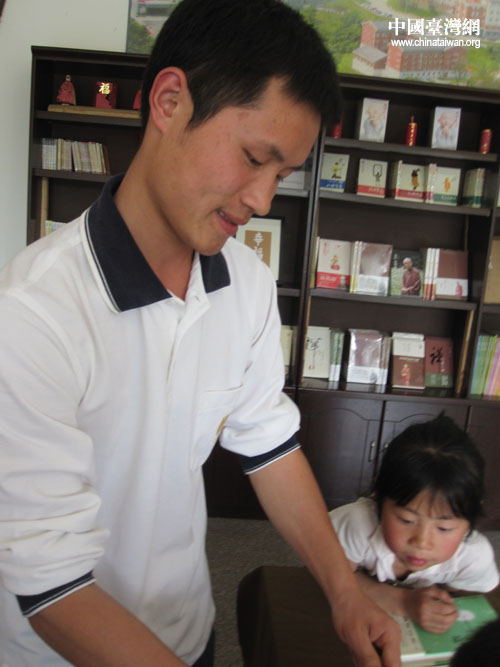 什邡安心站的志愿者邓兵向记者介绍法鼓山援助四川重建情况。(中国台湾网 朱毅 摄)