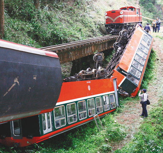 阿里山神木支线小火车27日中午载着300多名游客驶往阿里山站,途中边坡一棵青刚栎突然断裂,击中第七节车厢,前后四节车厢随即翻覆,造成5名大陆旅客死亡、107名陆客及本地导游轻重伤。图片来源:台湾《联合报》