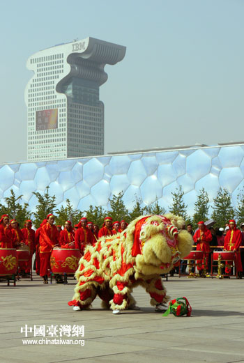 第二届“北京奥林匹克公园美食广场”28日在京开幕。图为开幕式现场的舞狮表演。(中国台湾网 邢同林 摄)