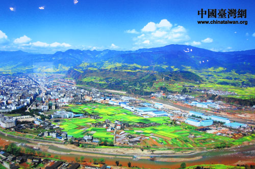 今日荥经,山绿水清,重建取得重大成效,翻拍自陈列馆图片。(中国台湾网 朱毅 摄 )