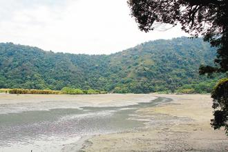 日月潭面临以往少见的大旱,进水口附近沙洲浮现,水位如果再降,游湖码头将封闭,届时势必冲击观光。图片来源:联合报