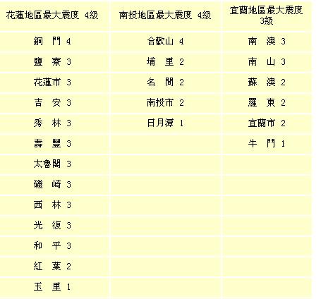 这起地震几乎全台有感,其它震度较大地区为花莲市、宜兰南澳3级;宜兰市、台东成功、台中市、苗栗市、彰化市为2级;台南市、新竹市、新北市、台北市为1级。(中国台湾网 冯存健)