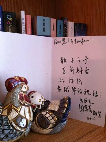 “执子之手,百年好合……”这是周美青亲自写下对黑人和范范的祝福,马英九贤伉俪不单单寄一张卡片,还送上象征“起家”、充满异域风情的木雕鸡摆饰。