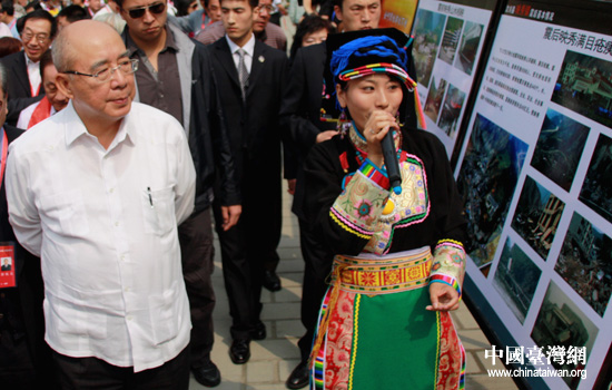 今日上午,国民党荣誉主席吴伯雄率领前来参加两岸经贸文化论坛的百余台湾嘉宾前往汶川映秀镇、水磨镇考察灾后重建情况。图为吴伯雄参访映秀镇并听取相关人员介绍灾后重建情况。(中国台湾网 高斯斯 摄)