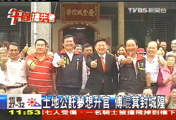中国台湾网5月7日消息 据台湾TVBS电视台报道,台湾花莲县吉安乡有尊土地公,向信徒托梦想升官变城隍爷,花莲县长傅崐萁应乡亲要求帮土地公升官,也掷筊(占卜用具)获得神明同意。报道称,只不过以前是天子封神,傅崐萁为地方父母官,帮土地公升官,情况少见。