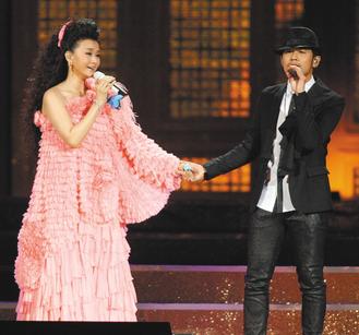 宋祖英(左)与周杰伦牵手合唱,台下爆出如雷掌声。图片来源:台湾《联合报》