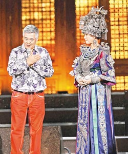 赵本山(左)演唱会上意外上场,逗乐宋祖英与台下粉丝。图片来源:台湾《中国时报》