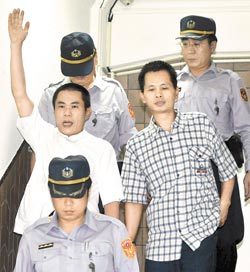 判死被告不满。陆正案更11审宣判,被告邱和顺(左)、林坤明步出法院时高喊司法不公,他们要再上诉。图片来源:台湾《中国时报》