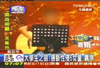 中国台湾网5月13日消息 据台湾TVBS电视台报道,日前,台湾某科技大学的李姓大学生,涉嫌猥亵性侵5名女童被羁押。
