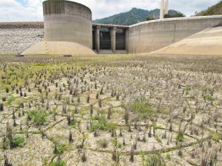 曾文水库最高水位227米,溢洪道是211米,水闸门最低的地方是206米,12日水位只剩188米。在水位计附近有大批浮覆地露出水面,持续高温日照下,地表严重龟裂,干旱情景令人怵目惊心。