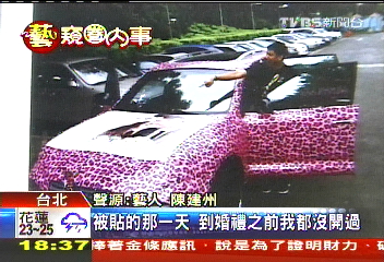 陈建州34岁生日当天,范玮琪联合好友恶搞,将他的爱车贴成粉红色豹纹车,结果遭到警方罚款。图片来源:台湾TVBS电视台