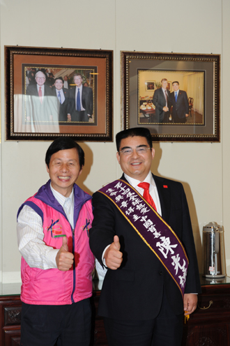 台湾周大观文教基金会负责人周进华为陈光标披上绶带并合影留念。图片由陈光标本人提供