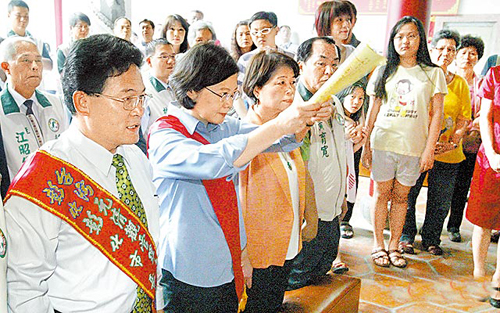 参拜吸票,蔡英文到彰化元清观参拜,亲拿祝祷文献给玉皇大帝。图片来源:台湾媒体