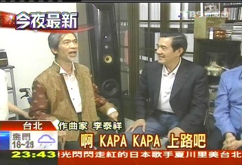 马英九昨晚探视时,不但送上慰问金,得知作曲用的计算机经常死机时,也一并帮忙解决,让久未开口唱歌大师很感动,立刻用歌声回报。“一条日光的大道,我奔走大道上,啊,KAPA KAPA,上路吧,这雨季不再来。(歌曲《一条日光的大道》)”