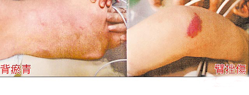 受虐女婴的背部有瘀青伤(左图),手臂也有咬痕与挫伤(右图)。图片来源:台湾媒体
