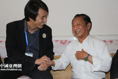 邵应壬老兵见到蔡秉宪等台湾同学们时分外激动,他们的手紧紧握在一起。(中国台湾网 杨永青 摄)