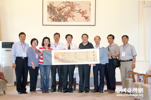 中国宋庆龄基金会秘书长李宁代表中国宋庆龄基金会向台湾基层民众大陆参访团赠送了代表中华民族传统文化的“晋唐心印”绢绣。(中国台湾网 普燕 摄)