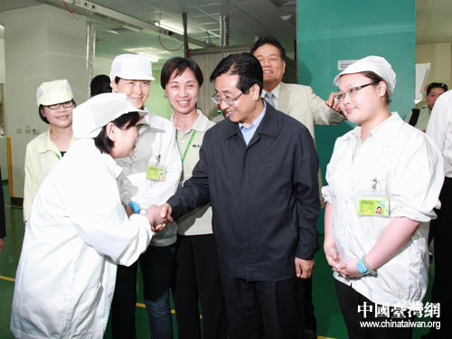 赵洪祝与台湾车王电子职工交谈(浙江台办 王健 摄)