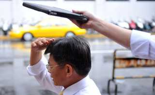 前高雄县长杨秋兴离开台湾“高等法院”时遇上午后雷阵雨,幕僚用平板计算机为他遮雨,形成有趣景象。图片来源:台湾“今日新闻网”