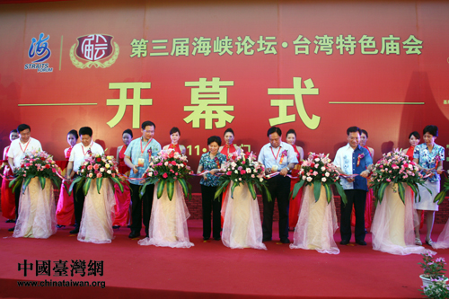第三届海峡论坛重要活动之一的台湾特色庙会今天下午举行开幕式。图为参加活动领导为开幕式剪彩。(中国台湾网 于斯文 摄)