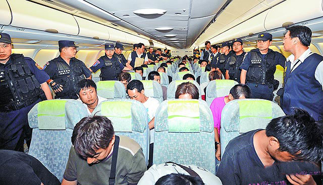 在柬埔寨落网的120名台湾嫌犯,先由大陆警方押解至澳门,台湾警方搭乘长荣A三三○空中巴士包机抵达澳门机场后,随即在停机坪与大陆公安包机进行交接,2架飞机间架设空桥,嫌犯一一验明身份、进行搜身后,随即带到长荣包机上铐入座。