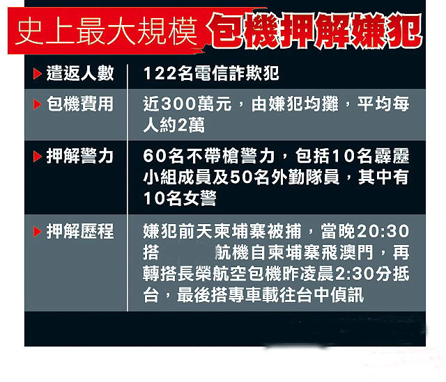 这次行动为台湾治安史上最大规模跨境扫荡诈骗集团行动,包机押解嫌犯的方式也被喻为是台版的“空中监狱”。图片来源:台湾媒体