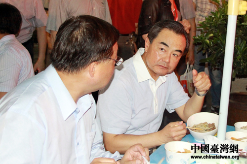 王毅品尝台湾特色美食——牛肉面,并与销售业者亲切交谈。(中国台湾网 王伟 摄)