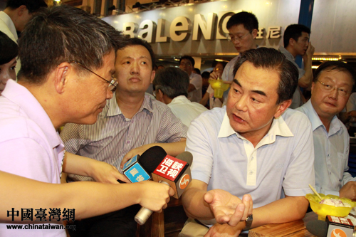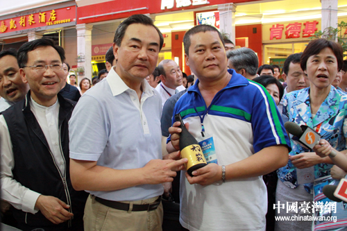 6月12日下午,正在厦门出席第三届海峡论坛的国务院台办主任王毅参观了在厦门市中山路举行的台湾特色庙会,并与台湾业者合影留念。(中国台湾网 王伟 摄)