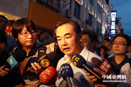 6月12日下午,正在厦门出席第三届海峡论坛的国务院台办主任王毅参观了在厦门市中山路举行的台湾特色庙会。图为王毅接受两岸媒体采访。(中国台湾网 王伟 摄)