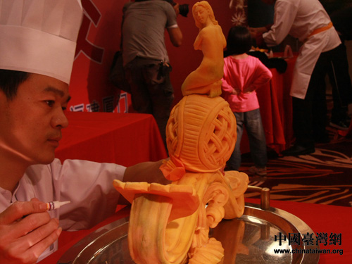 大陆选手林艺辉用南瓜雕刻《白鹭——女神牵手》。(中国台湾网 王晓蕊 摄)