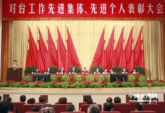 中国台湾网6月27日北京消息 对台工作先进集体、先进个人表彰大会今天上午在北京人民大会堂举行。中共中央政治局常委、全国政协主席贾庆林出席会议,会见对台工作先进集体和先进个人代表并颁奖。国务委员戴秉国出席会议并作重要讲话。中共中央台湾工作办公室、国务院台湾事务办公室主任王毅主持会议并宣读表彰决定。图为大会现场。(中国台湾网 田云鹏 摄)