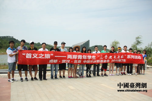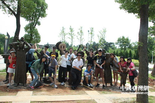 两岸大学生在中山舰博物馆外雕像前合影(中国台湾网 李丹 摄)